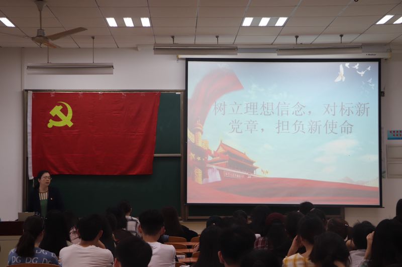 授课伊始,高璐敏老师以“树立理想信念,对标新党章,担负新使命”为主题,提出了中华民族走向富强的根源的问题,强调了理想信念的重要性。随后,高璐敏老师从“党章的重要地位”和“党章的发展与时俱进”两个方面对党章作了介绍,并提出同学们应当加强对新党章的学习的同时,端正入党动机、主动向党组织靠拢。