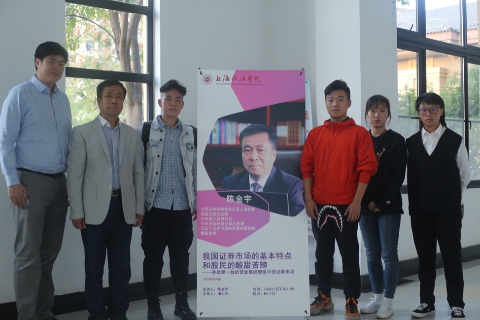 2019年10月31日下午,大同证券有限责任公司上海长寿路营业部总经理陈金宇先生受邀在新利18官方客服B4-102举办了一场面向上政师生的以“我国证券市场的基本特点和发展趋势”为主题的讲座。本次讲座,主要从证券市场的现状、主要作用、风险的表现和我国证券市场未来发展四个方面展开。