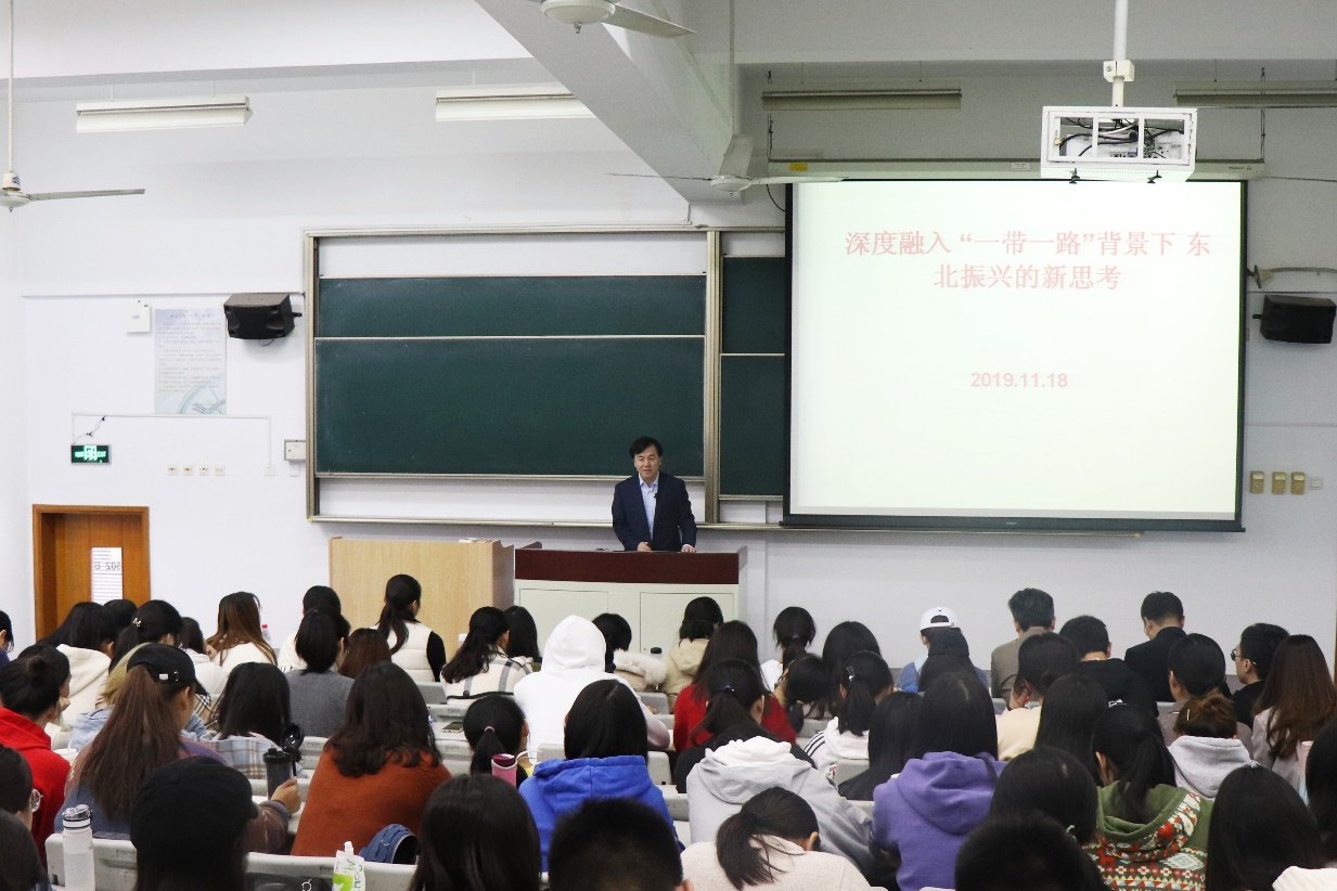 2019年11月18日上午,新利18官方客服庆祝建校三十五周年系列学术活动名家讲坛第四十讲在主教学楼502B开展,吉林省社会科学院副院长、《经济纵横》杂志社社长兼主编郭连强老师为我校师生带来题为“深度融入‘一带一路’背景下东北振兴的新思考”的讲座,讲座由经济管理学院院长刘志强教授主持,部分学院老师、学院全体研究生及会计学本科生参与聆听。