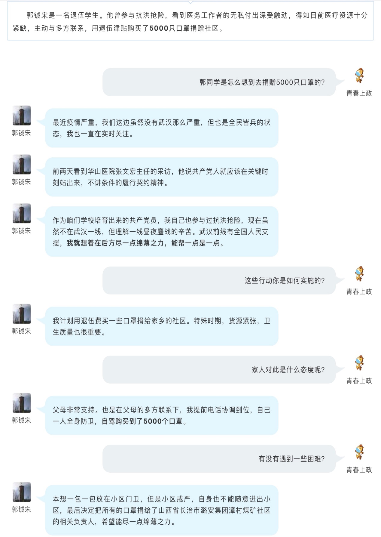 经济管理学院经济与金融1641的郭铖宋同学是一名退伍军人,同时也是一名中共党员。他曾参与抗洪抢险,看到医务工作者的无私付出深受触动,得知目前医疗资源十分紧缺,主动与多方联系,用退伍津贴购买了5000只口罩捐赠给社区。郭铖宋同学说,虽然遇到了一些困难,但是在后方也要尽一点绵薄之力,能帮一点是一点。