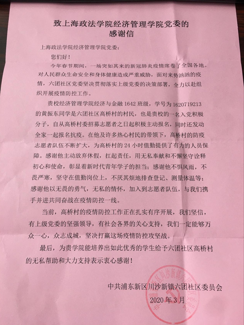 经济管理学院经济与金融1642班的黄振东同学是经济管理学院的一名入党积极分子,在其家乡村委招募志愿者时积极主动报名,同时还发动全家一起报名抗疫。在他及许多热心村民的带领下,防疫志愿者队伍不断扩大,为基层的24小时值勤提供了有力的人员保障。他以无畏的勇气加入到志愿者队伍,奋战在疫情防控一线,诠释了初心和使命,同时彰显了新时代青年学子的担当。