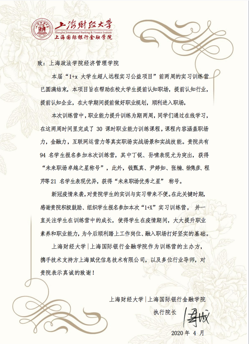 新冠肺炎疫情来袭,给2016级学生的毕业实习带来了不便。为确保2016级本科生达到毕业要求,顺利毕业,经济管理学院多措并举,积极拓展线上实习和学习渠道,保证每位学生都有机会参与线上学习和线上实习。经济管理学院和上海财经大学上海国际银行金融学院、中华会计网校、全国商贸职业教育集团等单位合作,推出了“1+X大学生远程实习”、助理会计师考试辅导课程、区块链普及教育课程等一系列免费的线上实习和学习项目。学生积极参与,认真实习,得到了举办单位的肯定,并发来感谢信。这一系列线上实习和学习,使得经济管理学院2016级毕业生在疫情期间,大大提升了专业知识、职业素养和职业能力,为今后顺利踏上工作岗位、融入职场打好坚实的基础。