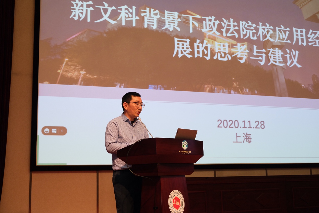 山东政法学院商学院董守海院长围绕“法商融合:新文科背景下商科人才培养”提出几点思考。董守海院长认为,经贸法学是未来学生的核心竞争力,也是政法院校最鲜明、最核心的特色,也是未来进行事实研究的核心。董院长强调“校企融合”的重要性,校企联合可以更好地培养应用型人才;同时提出“校际融合”、“开放办学”模式,旨在开拓学生视野。最后他强调“新文科建设最关键的是老师”,老师一定要有创新思维,积极鼓励老师创新,否则很难实现新文科建设和培养高层次的新文科人才。