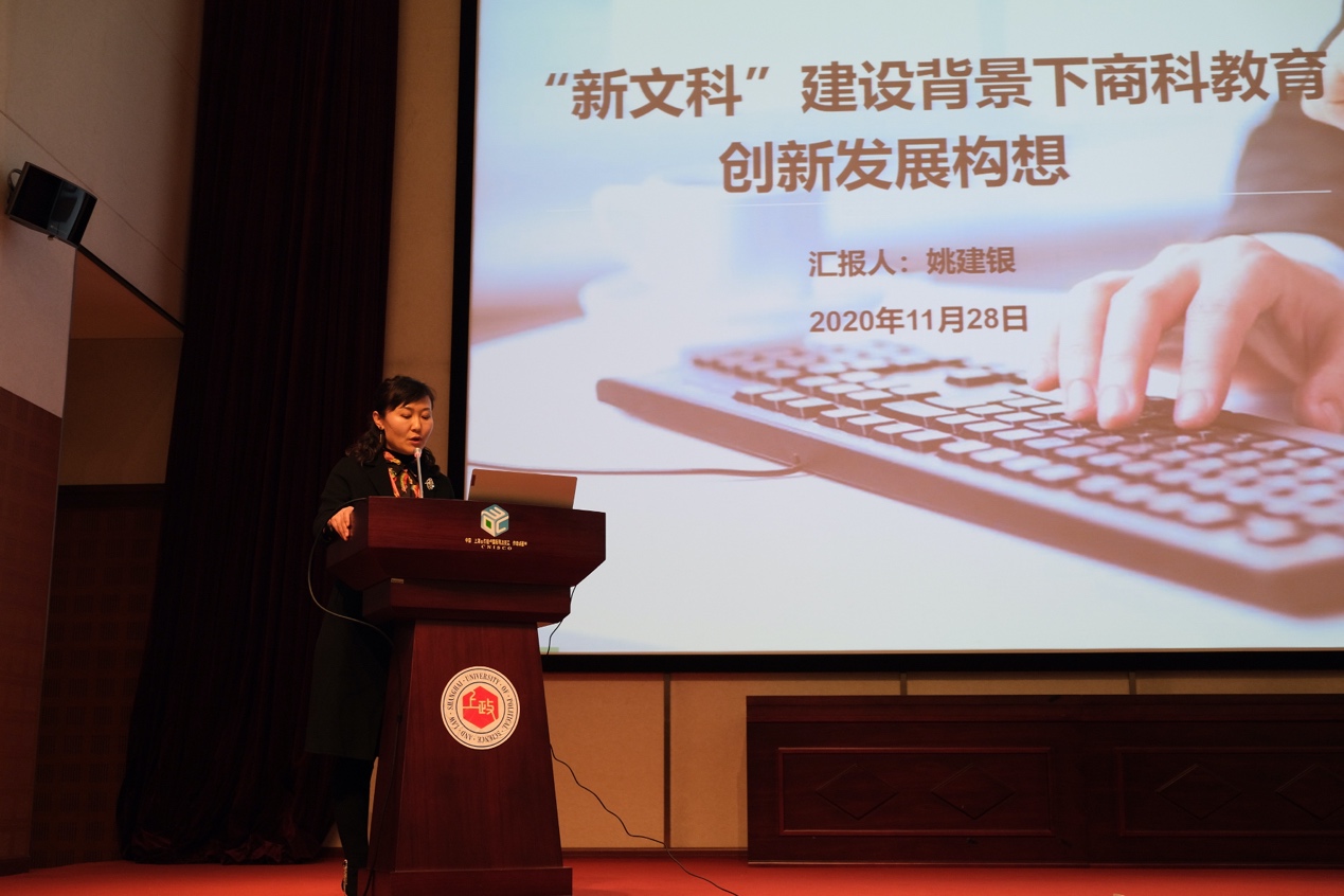 甘肃政法大学商学院党委副书记姚建银以本校商科教育的现状与问题为开端,重点阐述了商科教育创新发展的总体设想。姚建银书记认为,商科教育创新发展的改革方略有以下三个方面:“三个结合”引领商科教育转型升级、“开放办学”深化学科建设综合改革、“六位一体”助推“新商科”内涵提升。她强调商科教育的转型升级与内涵建设,是拟实现通识教育与个性发展相结合、课内知识与课外实践相结合、理论传授与价值引导相结合。