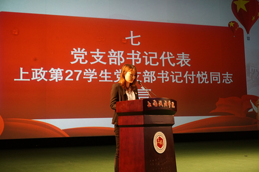 党支部书记代表上政第27学生党支部书记付悦同志发言。见证了54名同志宣誓入党的庄严时刻,作为支部书记的代表,付悦同志为他们送上了一份祝贺,同时希望大家能够牢记这一神圣的时刻,用行动恪守承诺,将入党宣誓作为自己终身的追求。