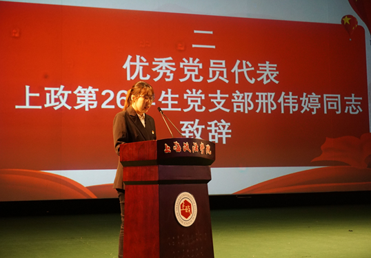 仪式第二项,优秀党员代表上政第26学生党支部邢伟婷同志致辞。邢伟婷同志作为党员代表,她向大家分享了自己过往经历,来表明,要成为一名合格的党员,绝不是一蹴而就的事。一个合格的党员,应该是思想、行动和能力的统一,这就要求大家,不仅仅要在思想上靠近党组织,同时,也要坚定自己的政治立场,坚守原则底线,在是非问题上绝不含糊。