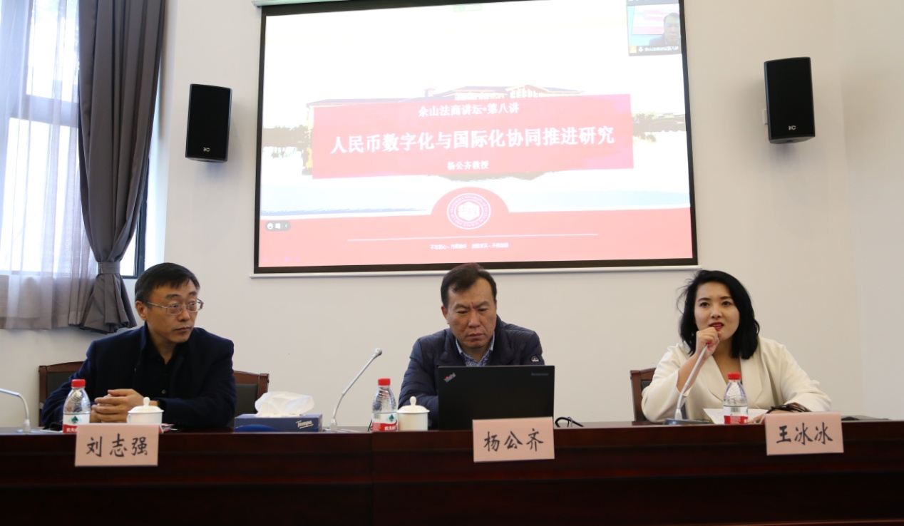 2020年12月18日下午,我校佘山法商讲坛第八讲在上合基地通过线下线上相结合的方式成功举行。广东金融学院科研处处长、《金融经济学研究》原副主编、广东省金融重点智库负责人、广东金融学院金融科技产业发展与政策研究院院长、广州市重大行政决策论证专家、广东金融学会学术委员杨公齐教授应邀来我校,为我校师生作了题为“人民币数字化与国际化协同推进研究”的精彩演讲。本次论坛由新利18官方客服经济管理学院主办,新利18官方客服研究生处协办,经济管理学院王冰冰老师主持。