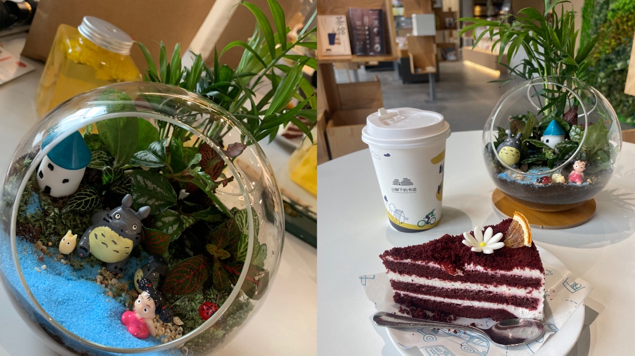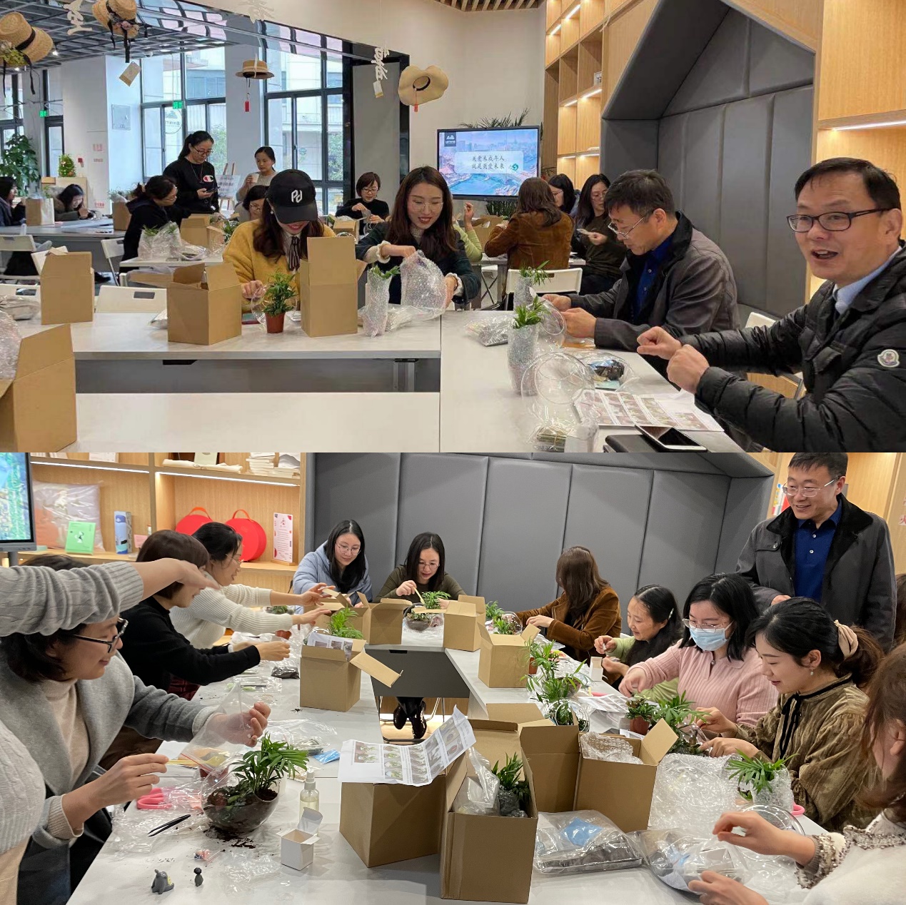 经济管理学院女教师们齐聚山脚下的书店,每人选用一个玻璃容器,在容器内先铺好青石、水台、接着装入营养土,最后摆上植物和装饰砂石以及公仔进行布景,制作了一个又一个充满盎然生机的微景观生态瓶。