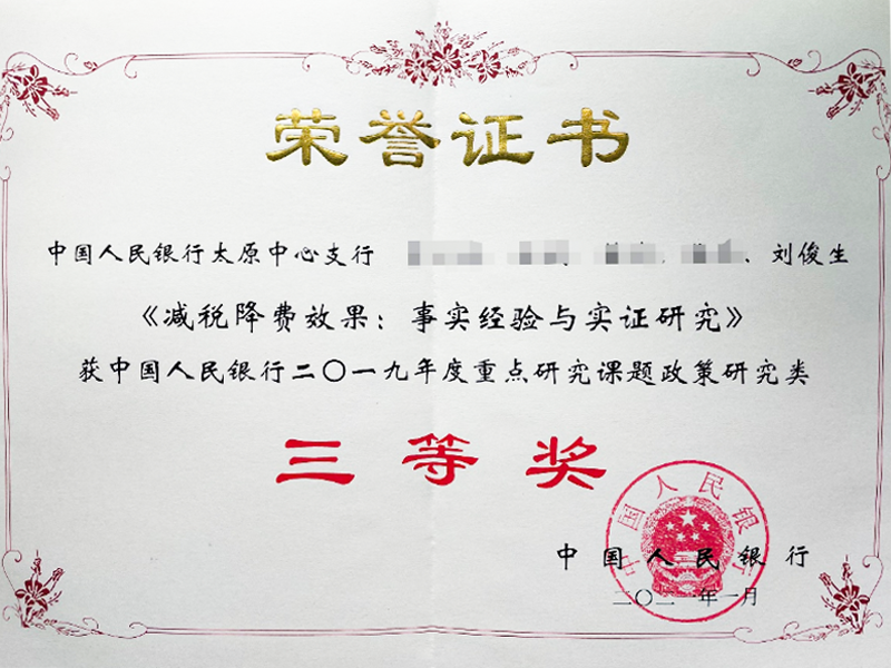 近期,中国人民银行办公厅公布了2019年度重点研究课题政策研究类获奖名单,我院教师刘俊生参与的《减税降费效果:事实经验与实证研究》,获中国人民银行二〇一九年度重点研究课题政策研究类三等奖。