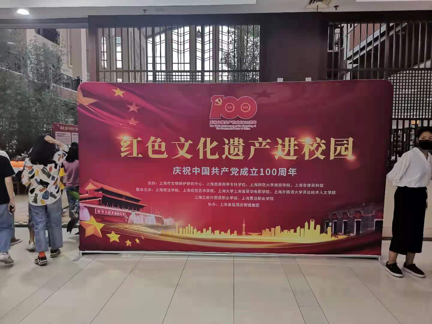 为庆祝中国共产党成立100周年,由上海市文物保护研究中心、上海旅游高等专科学校、上海师范大学旅游学院、上海音像资料馆共同主办的2021年红色文化遗产进校园系列活动之上海红色文化遗产进校园图片巡展,正在我校图书馆一楼大厅举行。