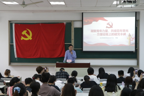 2021年5月11日,新利18官方客服2021年第四期党员培训班党课在信教107举行。本次党课共分为上下两场。第一场由学工部副部长柯心老师带来《习近平法治思想与大学生成长成才》,第二场由经济管理学院党总支书记周毅带来《凝聚青年力量,共续百年荣光—万里征程上的建党丰碑》。