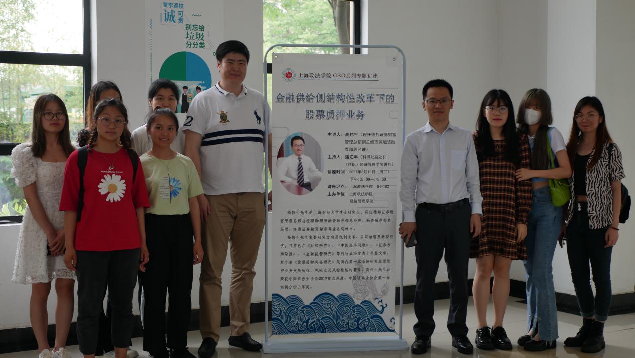 2021年5月12日,经济管理学院CEO系列专题讲座在B4-102教室如期举行。本次讲座特别邀请到了现任德邦证券财富管理总部副总经理兼融资融券部总经理、上海财经大学博士研究生高伟生先生,讲座题目为“金融供给侧结构性改革下的股票质押业务”。本次讲座由我校经济管理学院教师潘汇丰主持,两百余名学生参与讲座并交流讨论。