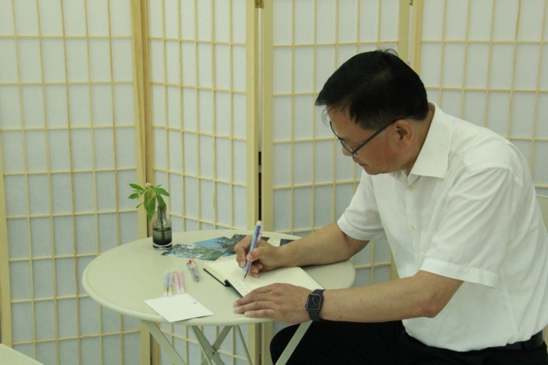 周毅参观摄影展后对馆里的布置表示肯定,并在留言簿上写下留言,希望经管学院的社区活动室“经澜馆”能受到师生的喜爱,更多有才华、有创意的同学能在这里聚集,能使其成为学生们喜爱并且愿意常来的社区空间,在这个空间里寻求更多的可能。