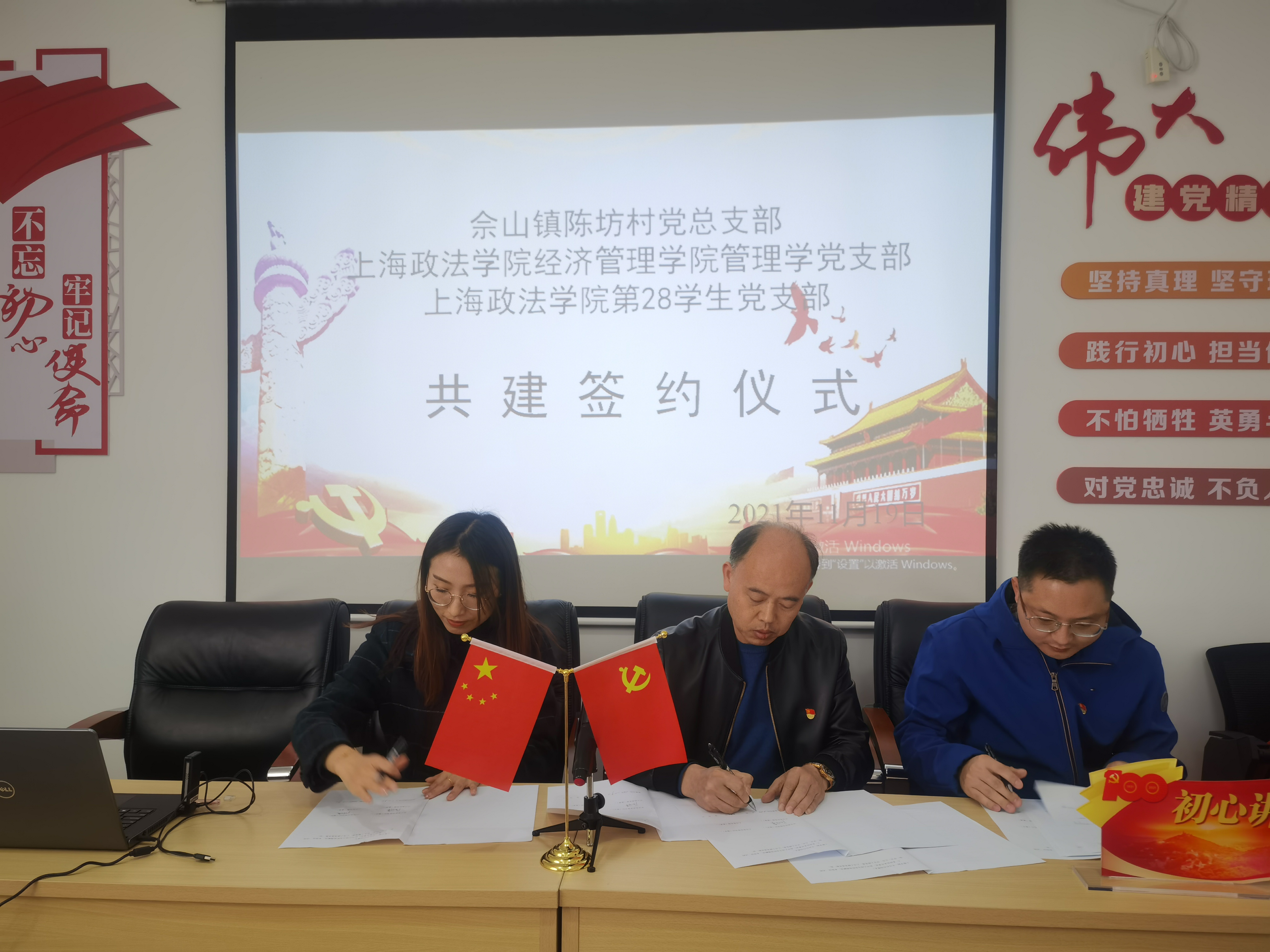 活动仪式上,三方互相介绍分享各自党建工作情况,就今后共建的内容、形式、要求进行了商讨研究,表示将通过村校党建共建推动阵地共创、产业共促,为服务地方经济发展贡献力量。随后,教工管理学党支部支委孔令媛、上政第28学生党支部支部书记郭平与陈坊村党总支书记陈国荣分别代表三方支部共同签订了共建协议。