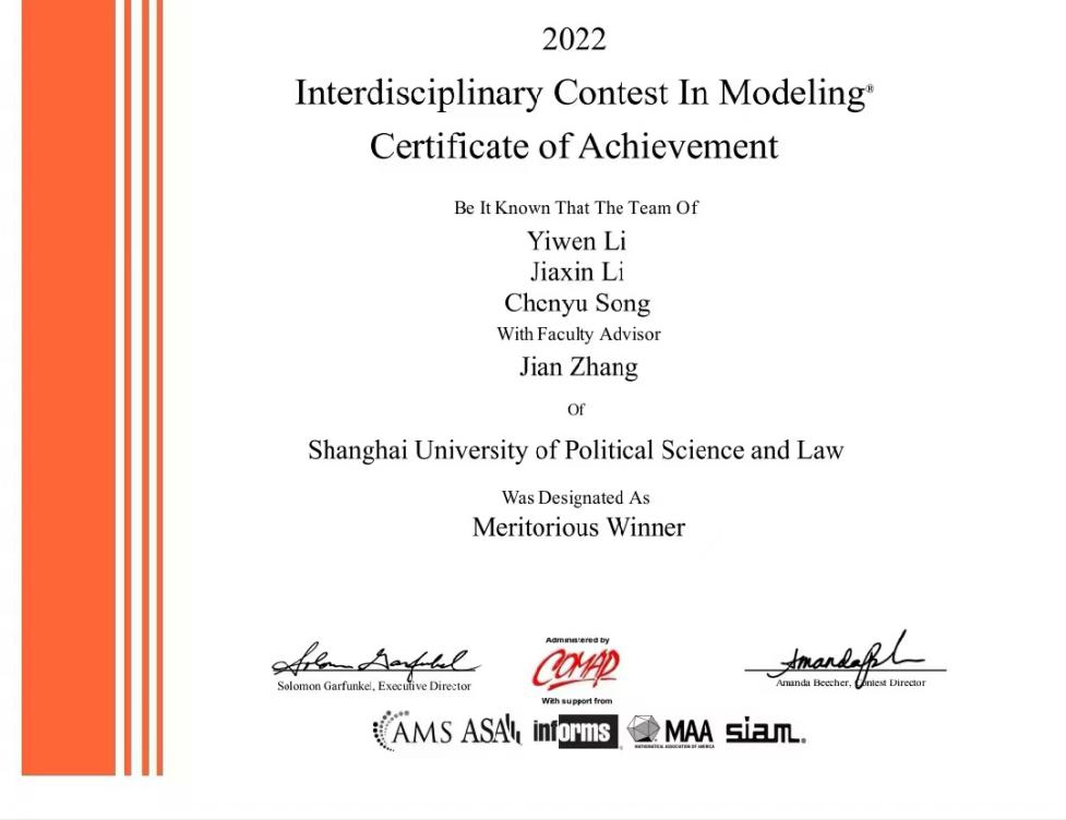 据官方统计,今年共有来自22个国家/地区的27205支队伍参赛,其中,由张健老师指导,李艺雯、李佳欣和宋晨昱同学参赛的项目获得国际一等奖,该奖项的获奖比例大约7%。李艺雯等团队成员在数天时间内,就指定的问题完成从建立模型、求解和验证到论文撰写的全部工作,从参赛队伍中脱颖而出。