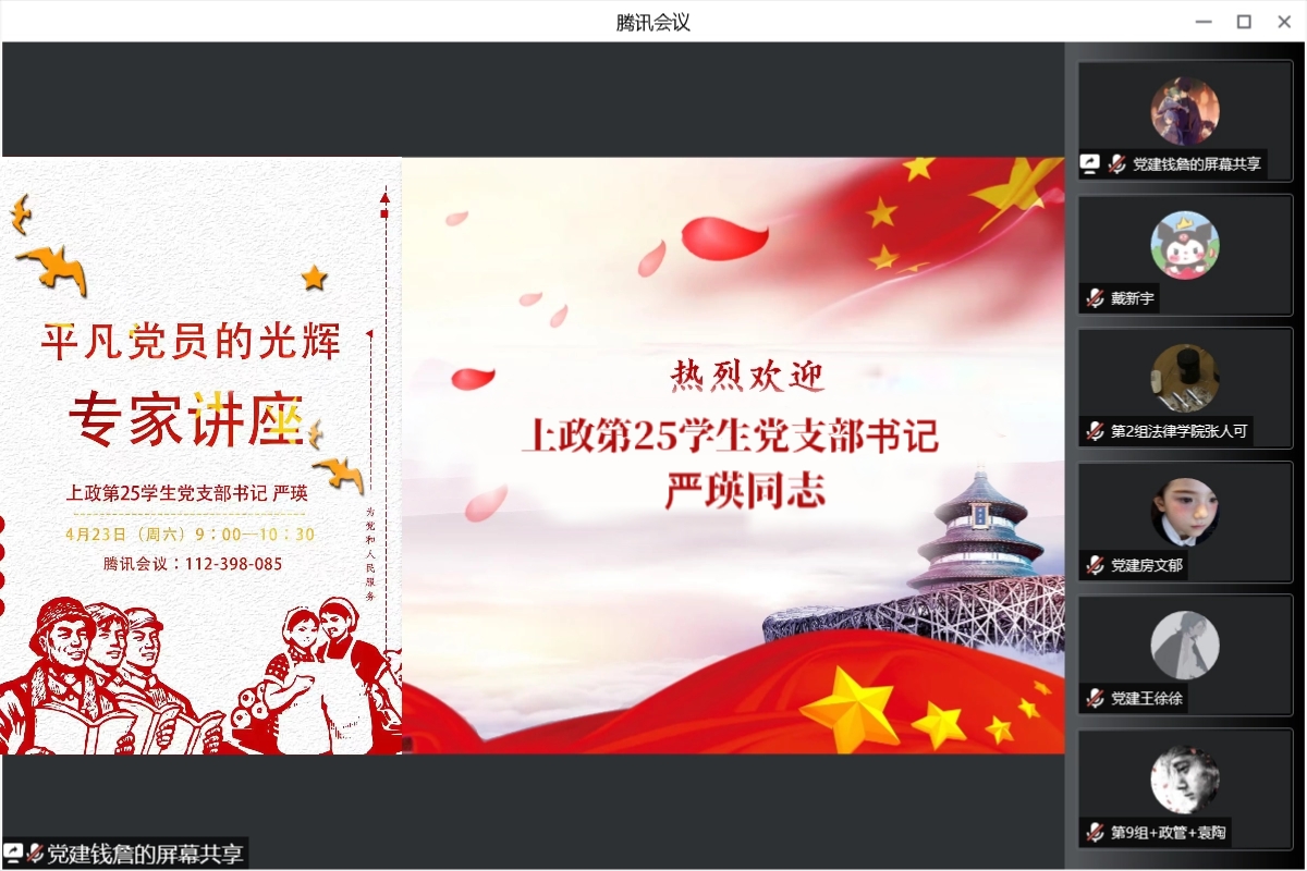 2022年4月23日,上政第25学生党支部书记严瑛带来了“平凡党员的光辉”专题讲座,经济管理学院党总支专职组织员徐璐、本次培训班的全体学员和经管招募的同学们参加了本次党课。