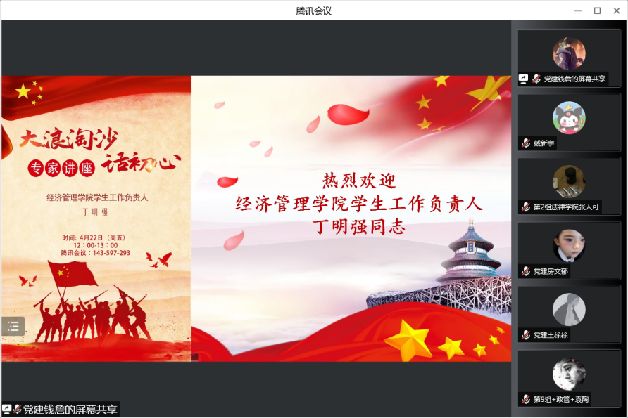 2022年4月22日,经济管理学院学生工作负责人丁明强带来了“大浪淘沙话初心:中共一大代表的异样人生”专题讲座,经济管理学院党总支专职组织员徐璐和本次党课的全体学员参加了本次党课。