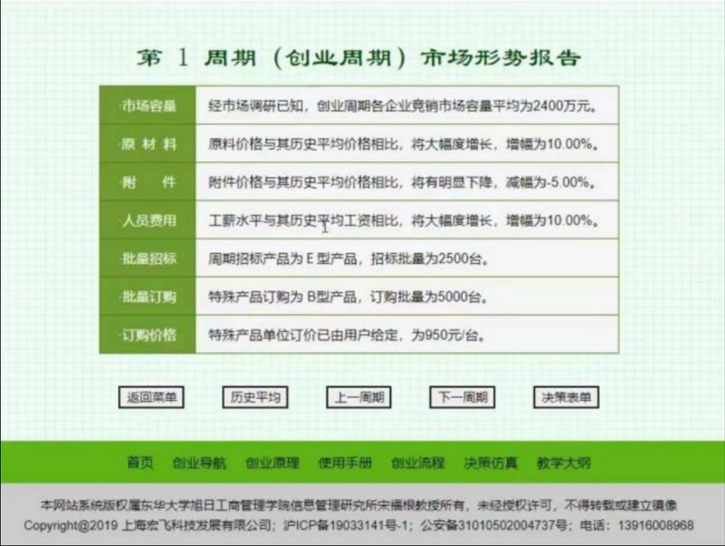 创业决策仿真大赛通过线上平台,模拟企业战略规划、市场营销、物资采购、产品研发、财务核算的模块操作,让每位参赛者在虚拟市场中做出企业决策,将商业理论应用于实践中。该比赛初赛共计5个周期,复赛7个周期,决赛10个周期,在比赛过程中可以使选手熟知现代企业创业创办流程,领会现代企业创业构建内涵,分析周期经济形势,树立市场竞争意识,突出以销定产理念,提高把握机会能力,揭示物料采购影响,了解产品成本费用形成,整合全面预算方法,掌握现代企业创业经营决策原理,提升创新创业决策能力。