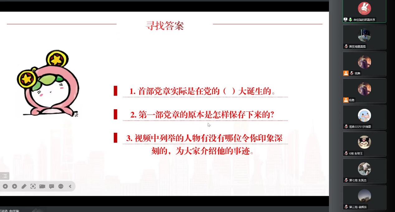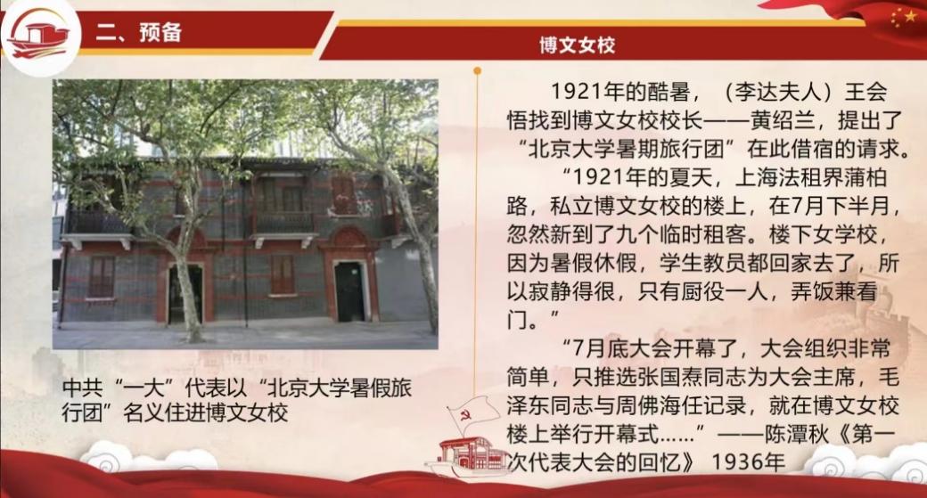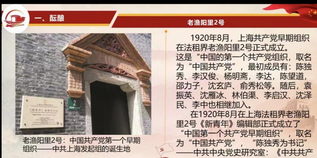 随后,上政第26学生党支部书记宫艺为大家教授入党培训第一课——中国共产党为什么在上海诞生。在正式开始前,播放了一段有关建党的视频,引入本节党课的主题。进入正题后,她先是阐述了中国共产党在上海诞生是一种必然的原因:上海经济与政治基础、思想准备、国际力量、阶级基础各方面条件酝酿成熟。其次,她以地点为线索介绍了“一大”召开四部曲,从老渔阳里2号的酝酿、到博文女校的预备阶段、再到于“一大”会址的开幕、最终以嘉兴南湖的闭幕为收官。课程的最后,宫艺老师也通过播放一段视频以带领大家回顾中国共产党百年奋斗历程。