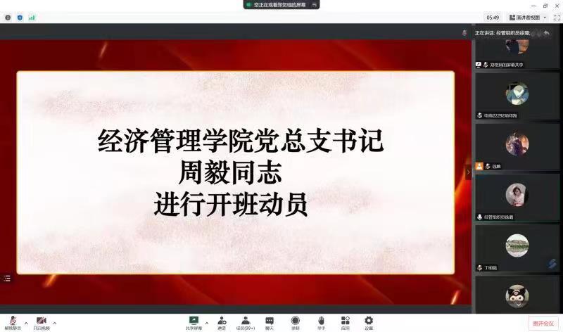 第二项,由经济管理学院党总支副书记丁明强同志介绍培训班的基本情况,内容主要包括开班典礼、专家讲座、结构化研讨、撰写党课小结、结业考试和结业典礼,表示此次培训活动旨在提高党员队伍素质能力,为党员队伍注入新鲜血液,希望各位学员在此次培训活动中严于律己,学习贯彻党的二十大精神,积极弘扬伟大建党精神、弘扬延安精神,自信自强、踔厉奋发,风雨无阻向前行,能够早日加入党组织。