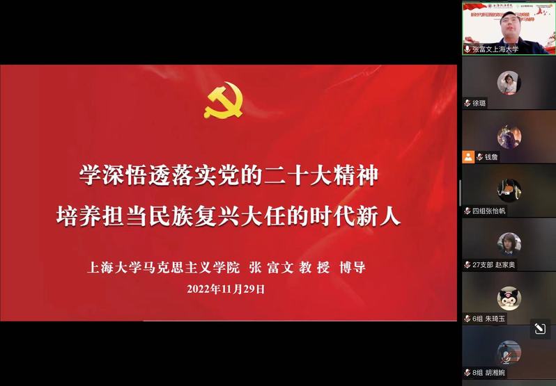 1129日下午经济管理学院召开新时代新征程的政治宣言和行动纲领——二十大报告学习辅导“专题党课。本次党课由上海大学马克思主义学院博士生导师——张富文教授主讲,第9期入党积极分子全体学员、经济管理学院领导班子、全体党员师生参与。