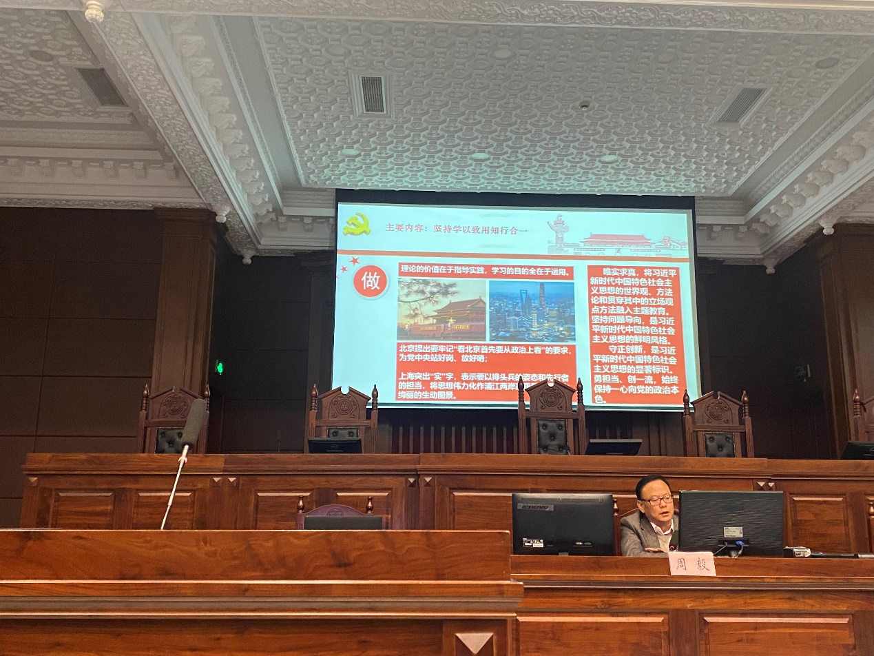 425日下午,经济管理学院党总支书记周毅在B4模拟法庭讲授《学习践悟强党性,踔厉奋发建新功—习近平新时代中国特色社会主义思想专题学习》专题党课。党委党校第5期培训班全体学员、经济管理学院全体教师党员参加。