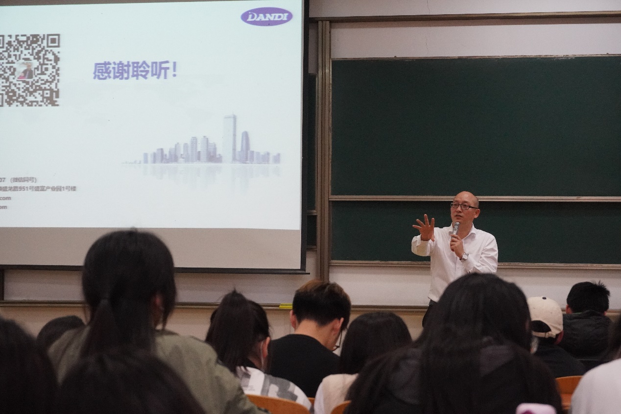 2015年9月,李俊先生创建了上海旦迪通信技术有限公司,该公司是一家专业致力于高端天线、智能模组、智能芯片研发设计,并提供北斗零部件和智能通信零部件应用解决方案的国家高新技术企业,目前在卫星导航产业领域拥有多项发明和实用新型专利。李俊先生作为核心创始人,主导了品牌创建和公司统筹管理,对公司战略规划、产品规划、市场营销及运营管理有着深刻独到的见解。讲座上,他从求学时代、职业经理人、韩国创业、国内创业、再次起航五个方面介绍了自己从大学时期到现如今的创业经历和15年以上公司整体运营管理经验。特别是,他提到了自己在大学时期就开始创业的准备,包括要积极参与社团活动、丰富自己的经验、提升思维意识,培养良好的人际关系、沟通能力和吃苦耐劳的精神。