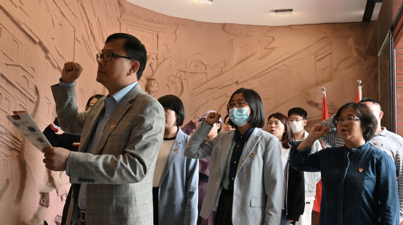 本次参观从一场生动的情景党课展开。在讲解员的带领下,教工党员们学习了中共三大的党史故事,回顾了北伐战争的相关史料,一起演唱了慷慨激昂的《北伐军歌》,深刻领会到中国共产党当年的艰难历程,再度回顾了那段烽火岁月。在扣人心弦的红色谍战故事之后,纪念馆设置了一场主题“密室逃生”,教工党员们被分为里外两支队伍,“里应外合”,一齐发挥眼力、脑力、心力,从重重谜题中找出逃生通路,最终成功会合。经过这场沉浸式体验,让教工党员们亲身感受到地下工作的残酷和先烈的艰辛。随后,教工党员跟随讲解员为在战争中牺牲的烈士们默哀献花,感怀先烈,纪念英魂。在鲜红的党旗下,周毅举起右拳,带领全体党员重温入党誓词,铿锵有力的宣誓声响彻大厅。