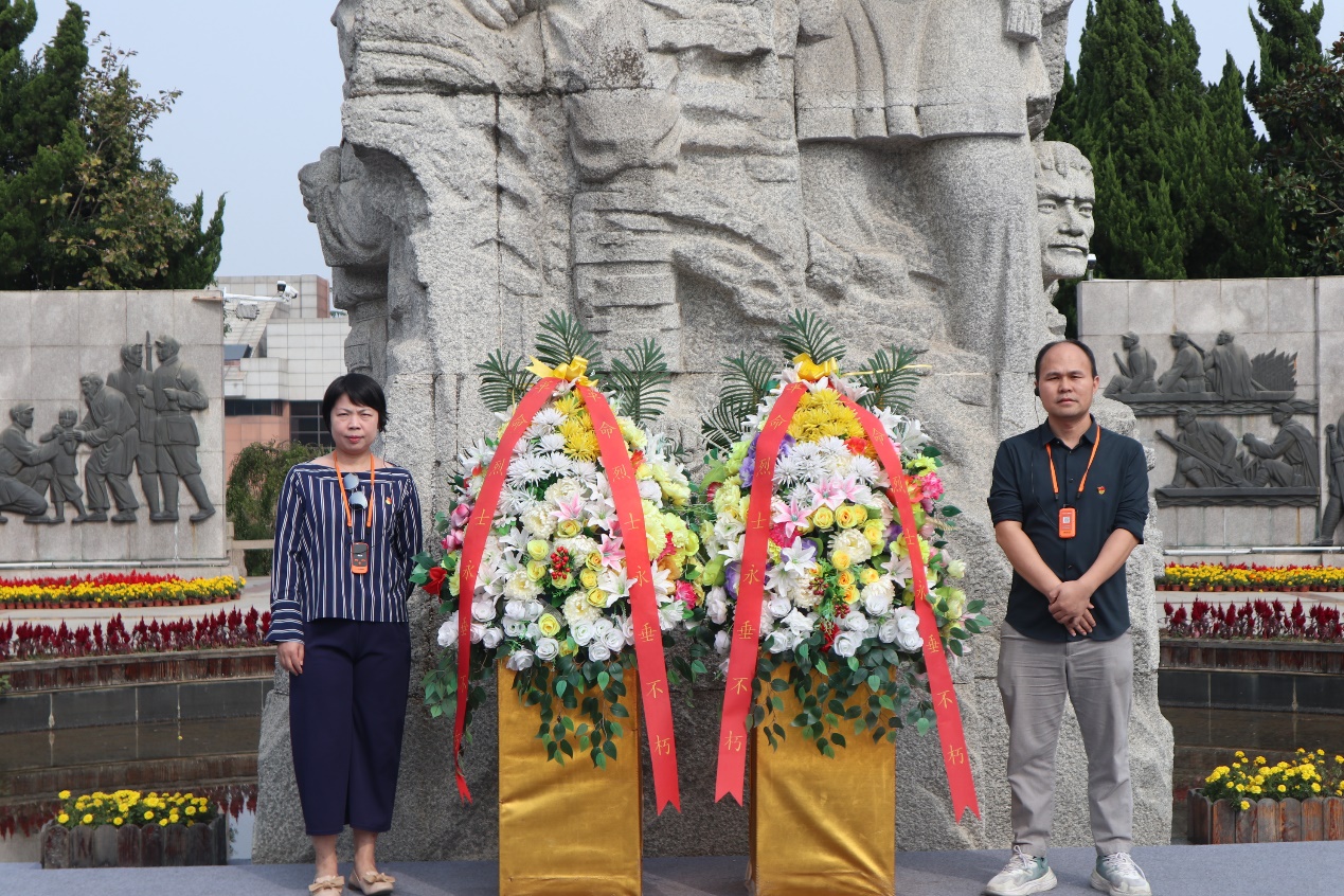 全体师生在瞻仰广场纪念碑前肃穆行礼,经济管理学院党委书记周毅,党委副书记、院长刘志强,副院长刘宪,工会主席黄慧作为代表向革命先烈敬献花篮,教工党支部书记马忠新、程利敏上前整理花篮缎带,向先烈致敬。