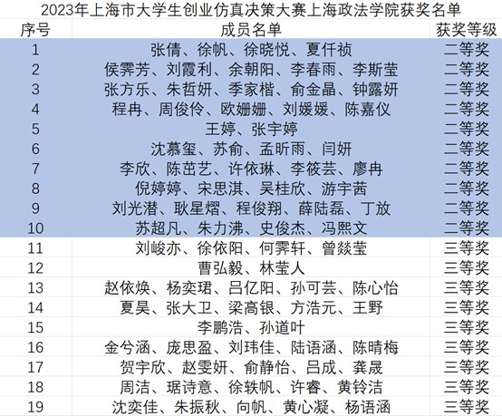 青春的朝气,是中国进步的强大力量,青春的激情,是中国革新的动力源泉,青春的奋斗,是中国不屈的时代风貌。经过2023年上海市第十届大学生创业决策仿真大赛,我院共有19支队伍脱颖而出,其中10支队伍荣获市二等奖,9支队伍荣获市三等奖。