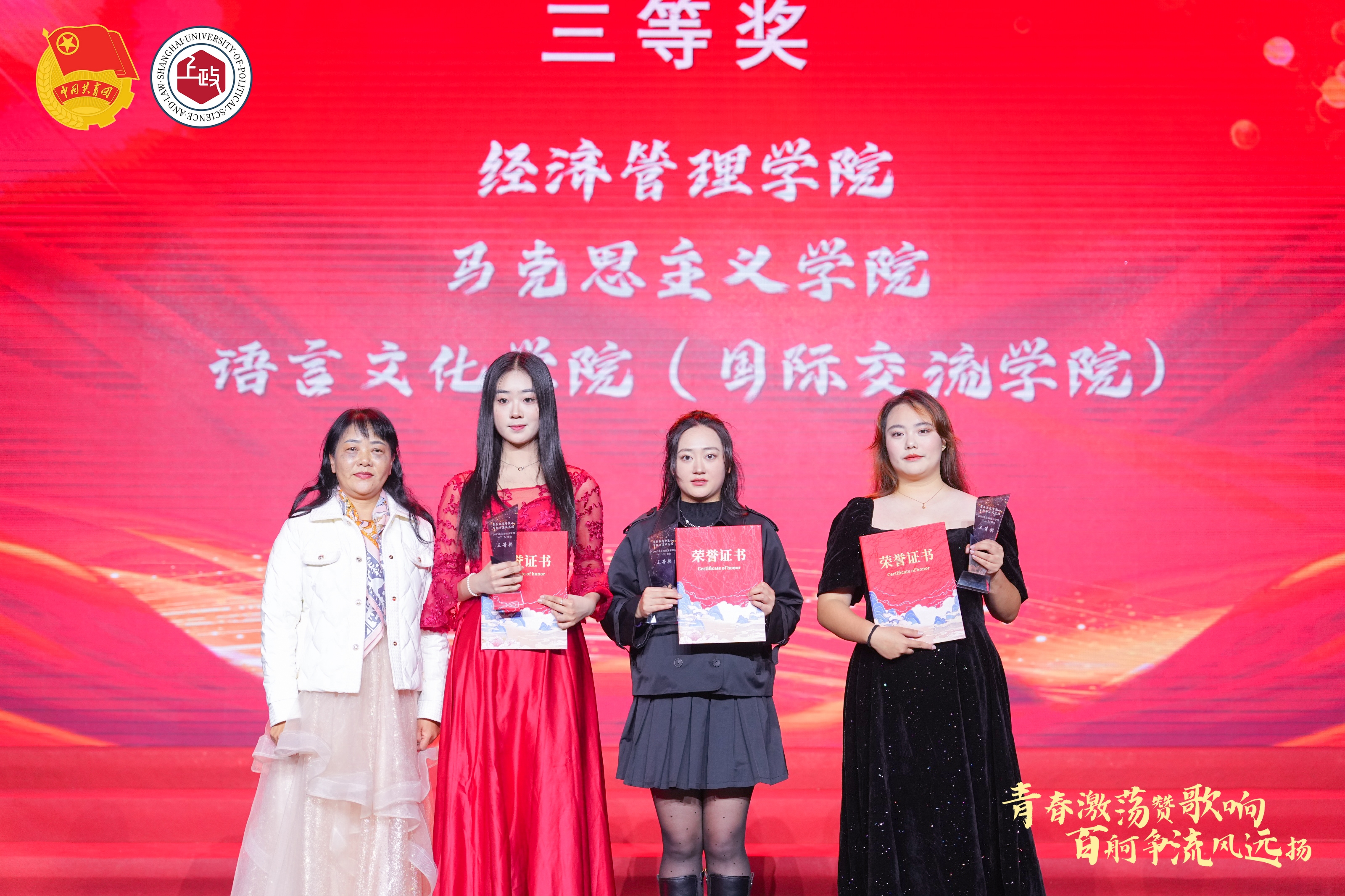 在此次红歌会中,经济管理学院以激昂的热情、饱满的斗志,荣获了第四名即三等奖的好成绩。在舞台上,经管学子们坚毅的目光,仿佛让我们看到了先辈们英勇不屈的身影。新的远征已启航,我们将坚守初心,砥砺前行,以歌声谱写新时代的华彩篇章。
