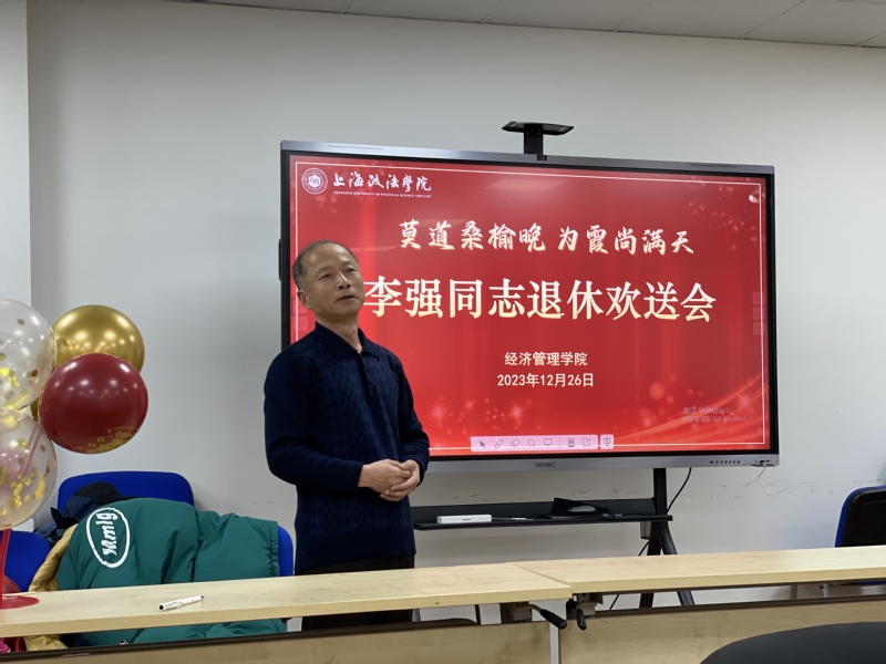由陈雪婷老师主持李强教授的荣休仪式。李强教授多年来为学院的发展作出了卓越的贡献。从国际贸易的专业发展、经济与金融专业的申请和建设,到国际商务硕士点的申请和建设上,付出了巨大的努力。在仪式上,数位毕业多年的经管学子通过视频转达了他们对李强教授的祝福和感恩。周毅书记和刘志强院长分别发言,表达了学院对李强教授多年辛勤付出的感激之情。冯涛教授通过视频连线送来祝福。工会主席黄慧老师代表学院向李强教授献花,万兰兰老师代表经济与金融教研室向李强教授赠送了纪念品。李强教授发表感言,分享了自己多年来的工作心得和感悟。他表示,能够在经济管理学院工作是他一生的荣幸,感谢学院领导和同事们的关心与支持。他将继续关注学院的发展,为学院未来的繁荣贡献自己的力量。最后,全院老师一起与李强教授合影留念,祝福李强教授身体健康万事如意。