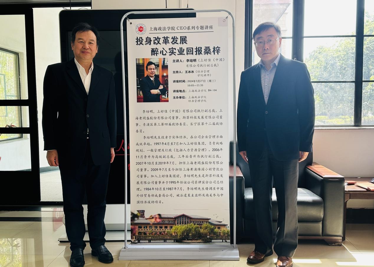 2024年3月27日,经济管理学院CEO系列专题讲座在本校区B4-104教室举行。本次讲座特别邀请上好佳(中国)有限公司执行副总裁、上海老同盛股份有限公司董事、斯菲科技发展有限公司董事、青浦区第三第四届政协委员、长宁区第十二届政协委员李培明先生,为同学们带来“投身改革发展,醉心实业回报桑梓”的专题讲座。