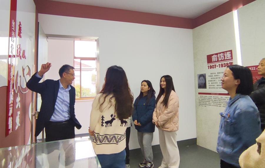 座谈结束后,与会人员共同来到爱国村“红韵爱国”教育展厅开展共建联学主题党课活动。在展厅内,张书记深情讲述了爱国村革命烈士俞仿莲的英勇事迹。俞仿莲是陈云同志的秘密机要员,从事党的机要联络、接应地下工作者传递党的秘密文件等工作;抗日战争时期,跟随陈云回到青浦西乡开展抗日武装斗争,在党的隐蔽战线开展工作,沉着冷静、敏捷机智,后因积劳成疾而病逝,享年31岁。俞仿莲等革命烈士的事迹让在场人员深受感动。活动最后,双方共同合影留念。