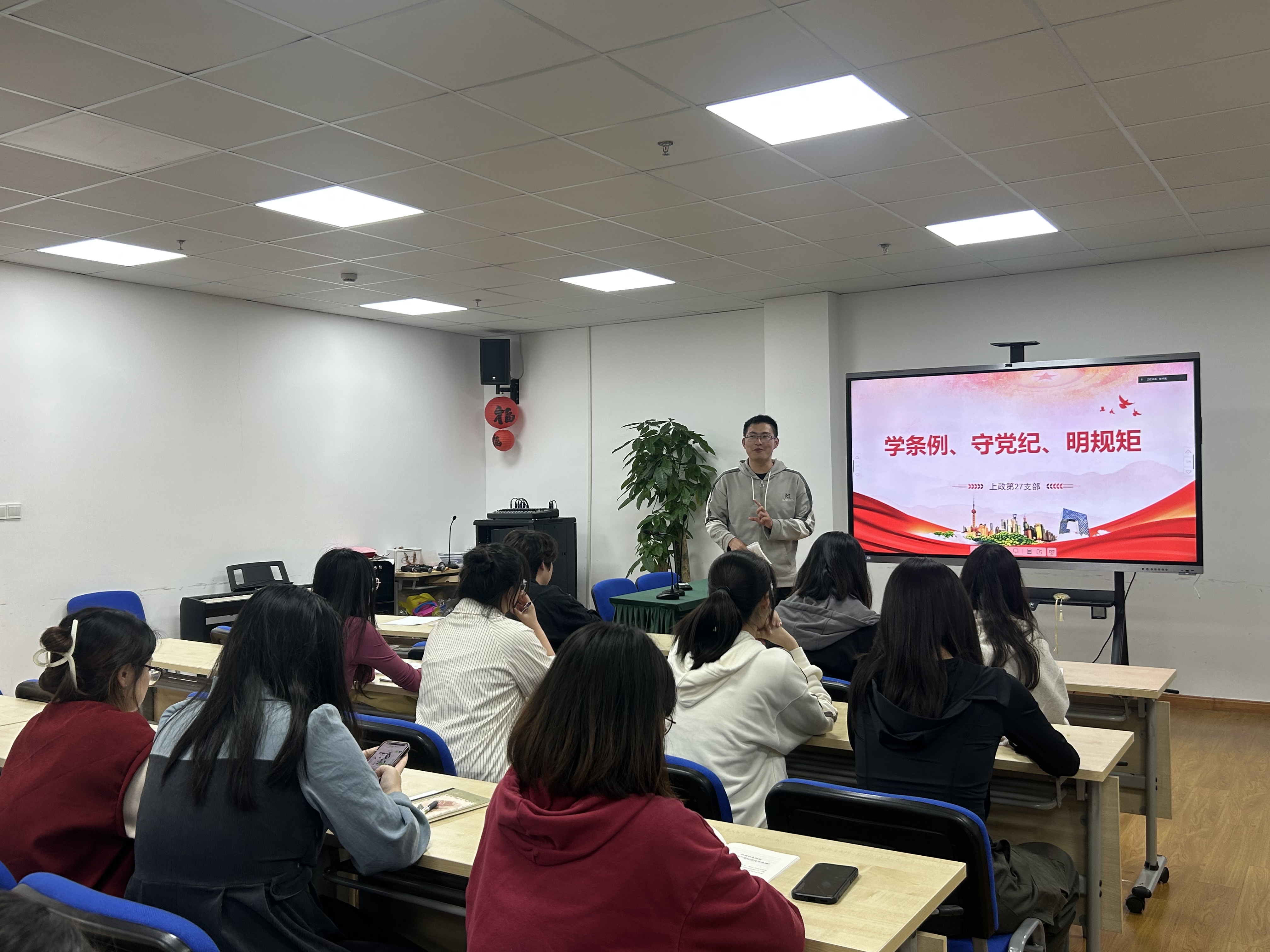 为深入开展党纪学习教育,强化党员的纪律意识,增强政治定力,提升党性修养,5月9日,上政第27学生党支部在经济管理学院二楼会议室开展了“学条例、守党纪、明规矩”党纪学习教育主题党日活动,逐章逐条学习《中国共产党纪律处分条例》。活动由支部书记余佳瑞主持,上政第27学生党支部全体学生党员参与。