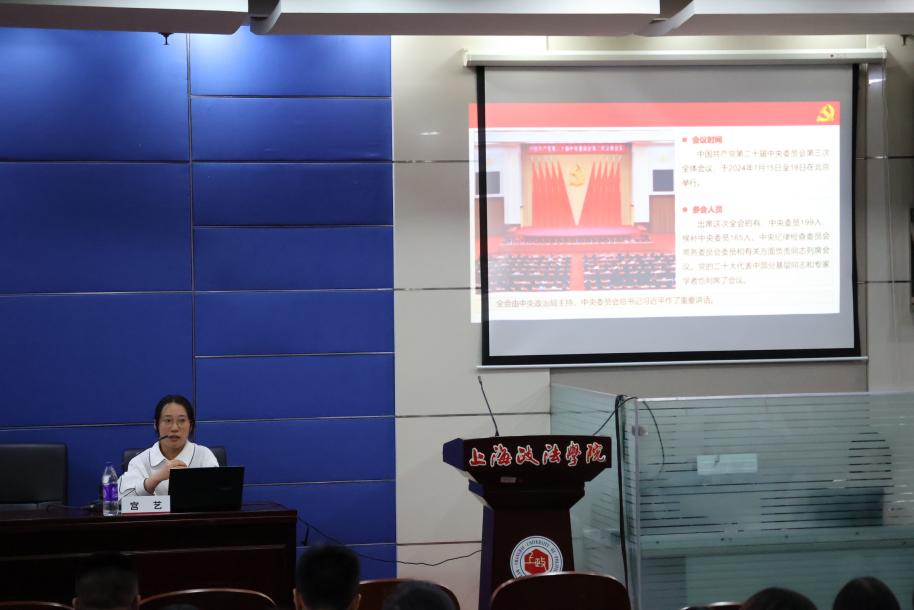 上政第26学生党支部书记宫艺为学员们讲授本期培训班的第二课《党的二十届三中全会解读》。她指出,学习贯彻党的二十届三中全会精神的意义所在,并说明了“七个聚焦”的基本内容;同时强调了进一步全面深化改革、推进中国式现代化的重要性,阐述了党对于进一步全面深化改革的总目标以及系统部署。