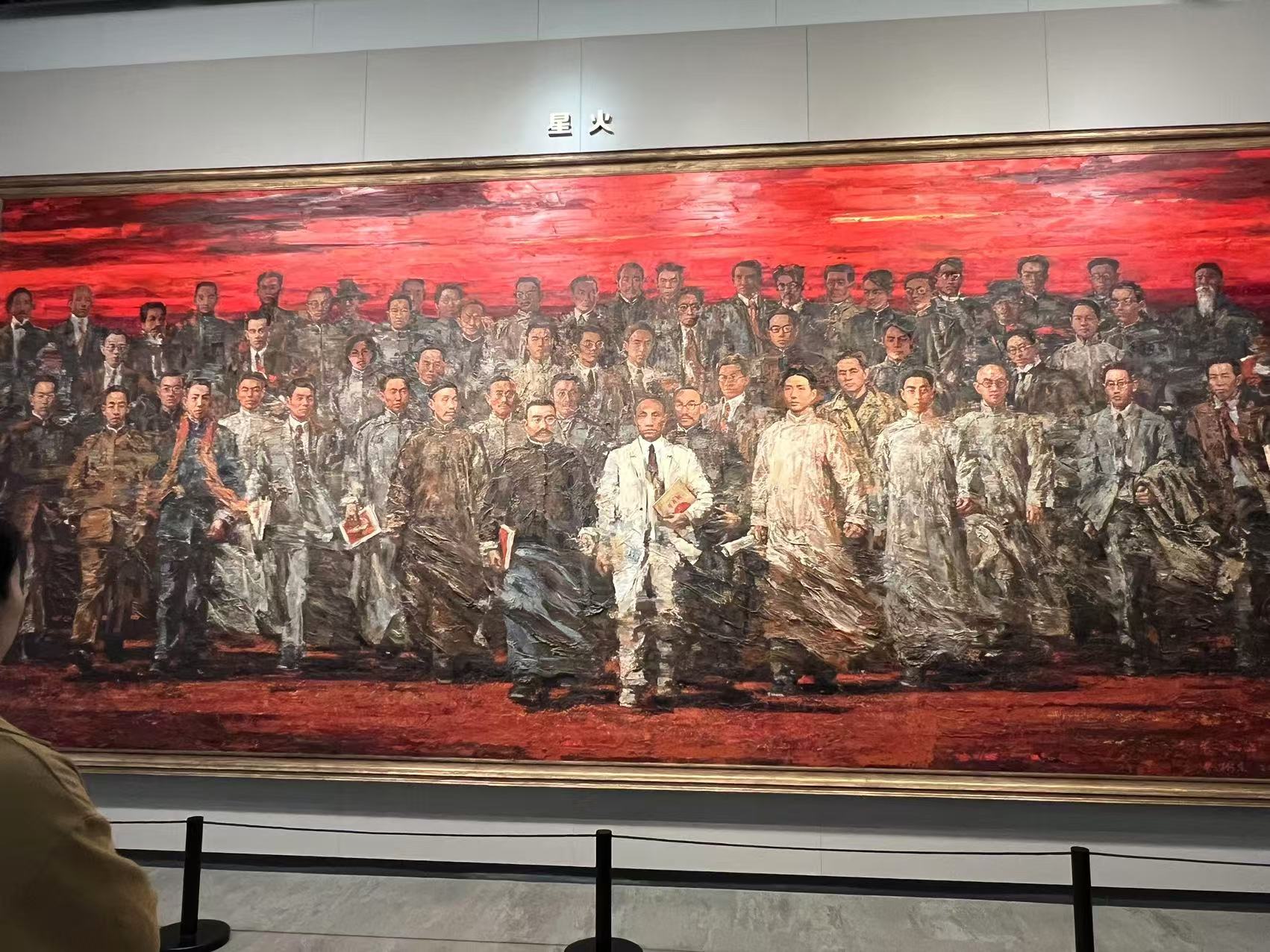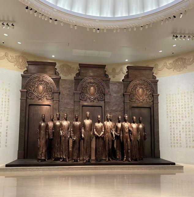 进入纪念馆,前厅正面照壁及两侧墙面的三组大型陶板装饰浮雕,左侧为“中流砥柱”,右侧为“民族脊梁”;中间照壁为“日出东方——从石库门到天安门”历史组画,反映了中国共产党由小到大、由弱到强,带领全国各族人民取得新民主主义革命伟大胜利的历史征程一代代中国共产党人,不忘初心牢记使命,书写了气壮山河的人类史诗,凝聚起亿万人民共创未来的磅礴力量!