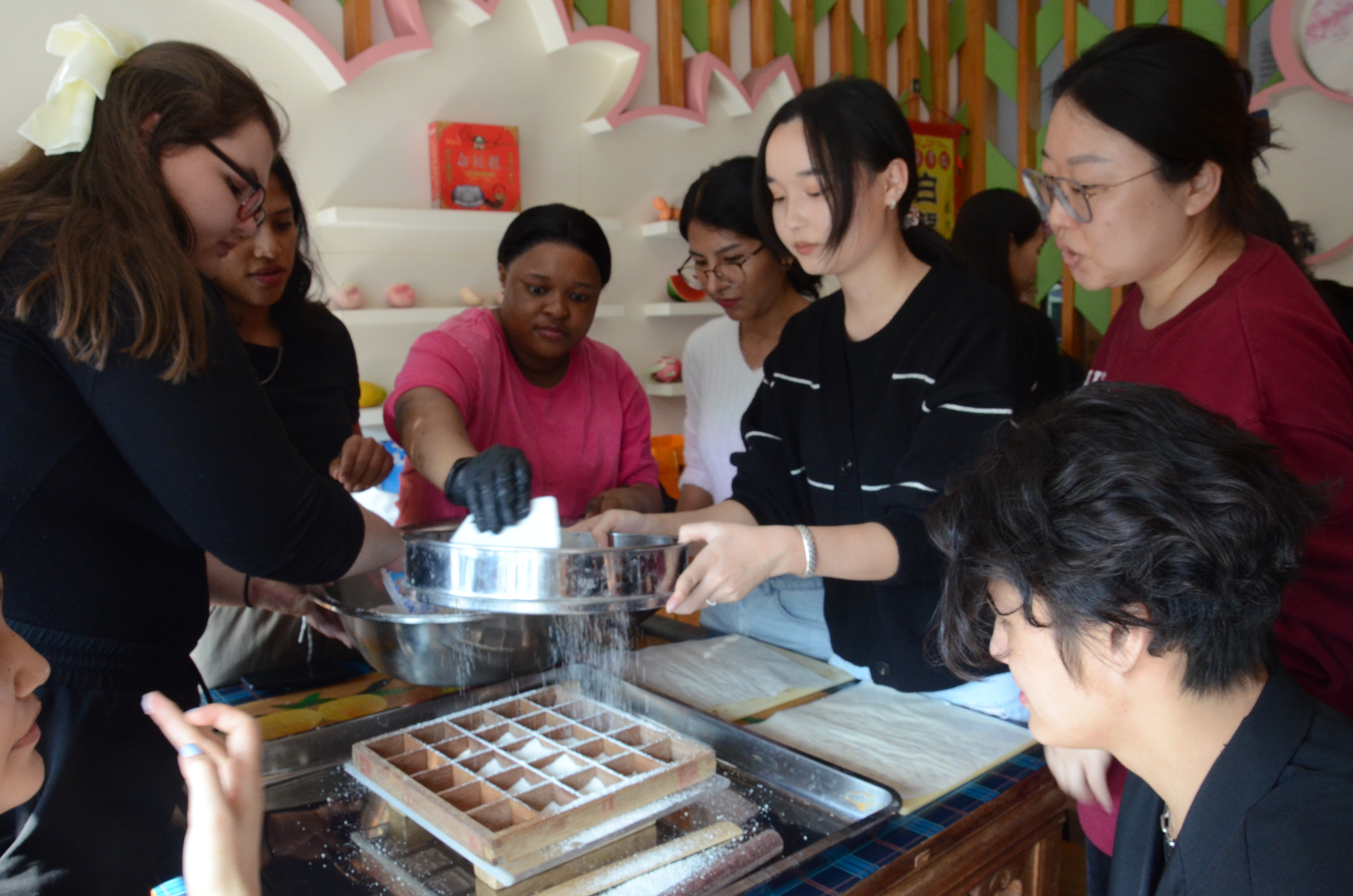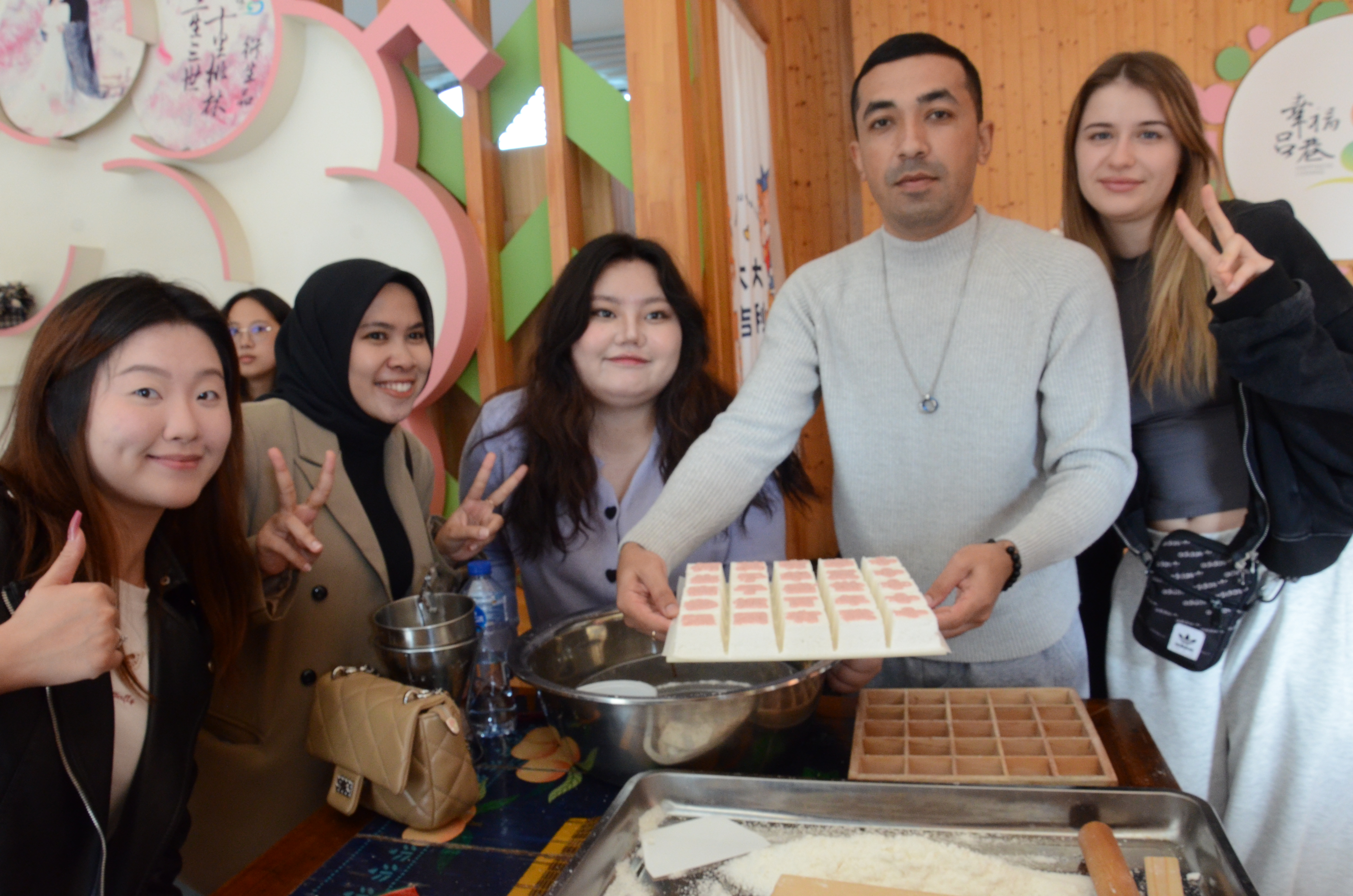 在金山非遗美食白龙糕的制作现场,留学生们更是热情高涨。在第四代传承人陆师傅的指导下,他们分组协作,亲手制作白龙糕。从搅拌米粉、添加馅料到蒸煮成品,每一步都充满了乐趣和挑战。留学生们不仅感受到了中华美食文化的博大精深,更在劳动实践中体会到了团队协作的力量与辛勤付出的价值。
