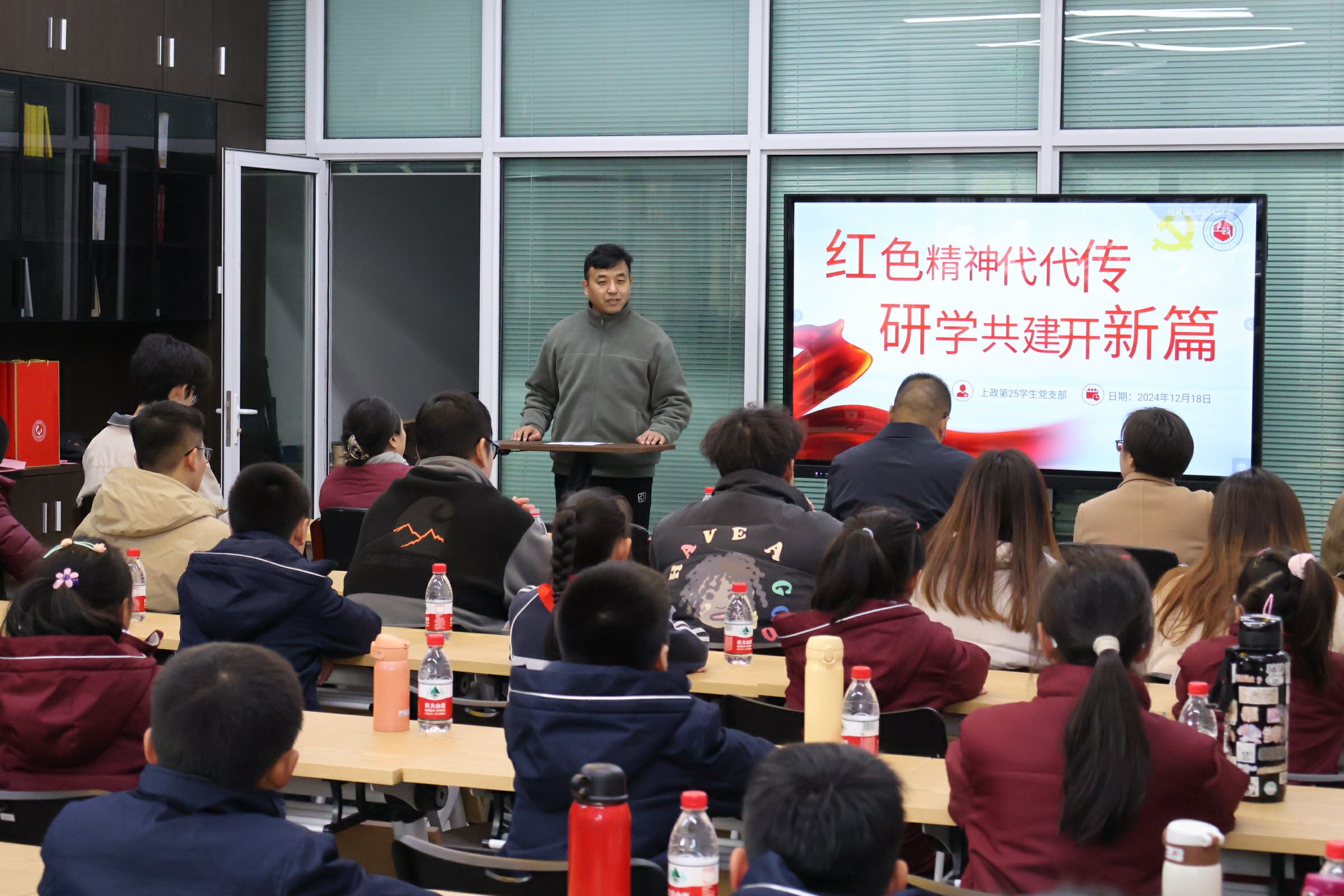 上政第25学生党支部党员陈博以《红色精神代代传,研学共建新篇章》为题,为实验小学和豫英小学的同学们介绍了四位来自上海青浦区的优秀党员——陈云、王春龙、俞雄辉和朱峰,让同学们深刻认识到红色精神是激励我们不断前进的强大动力,鼓励同学们在今后的学习和生活中要以更加饱满的热情和更加坚定的信念传承红色精神,为实现中华民族伟大复兴的中国梦贡献自己的力量。