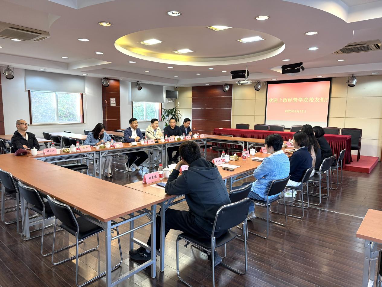 在真陈路 818 号会议室的座谈环节,丁明强向校友们介绍了学院近年来在学科建设、人才培养上的突破进展,强调“校友是学院发展的宝贵财富,是连接校园与社会的重要桥梁”。潘雄则围绕校友会工作规划提出倡议,呼吁校友们常回母校、反哺母校,在资源对接、平台搭建中凝聚发展合力。