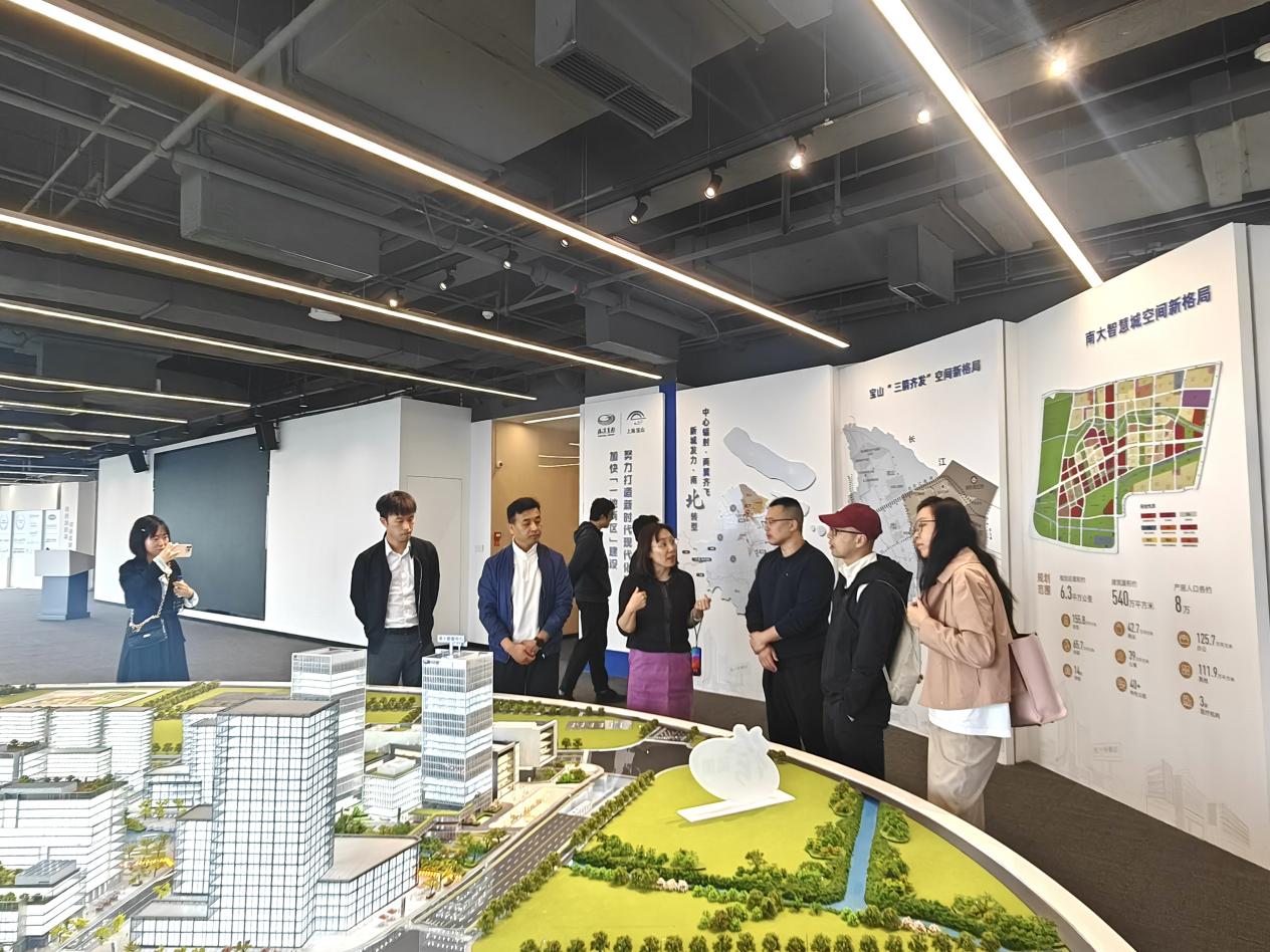 校友一行首先抵达南大双子楼A幢,参观南大规划发展展厅。在详实的沙盘模型与多媒体演示中,众人深入了解临港校区“产教融合、城校互动”的建设蓝图。丁明强表示:“南大临港的创新模式为我们打开了产教协同的新视野,期待以校友为桥,联动更多高校企业,共绘区域经济发展新图景。”