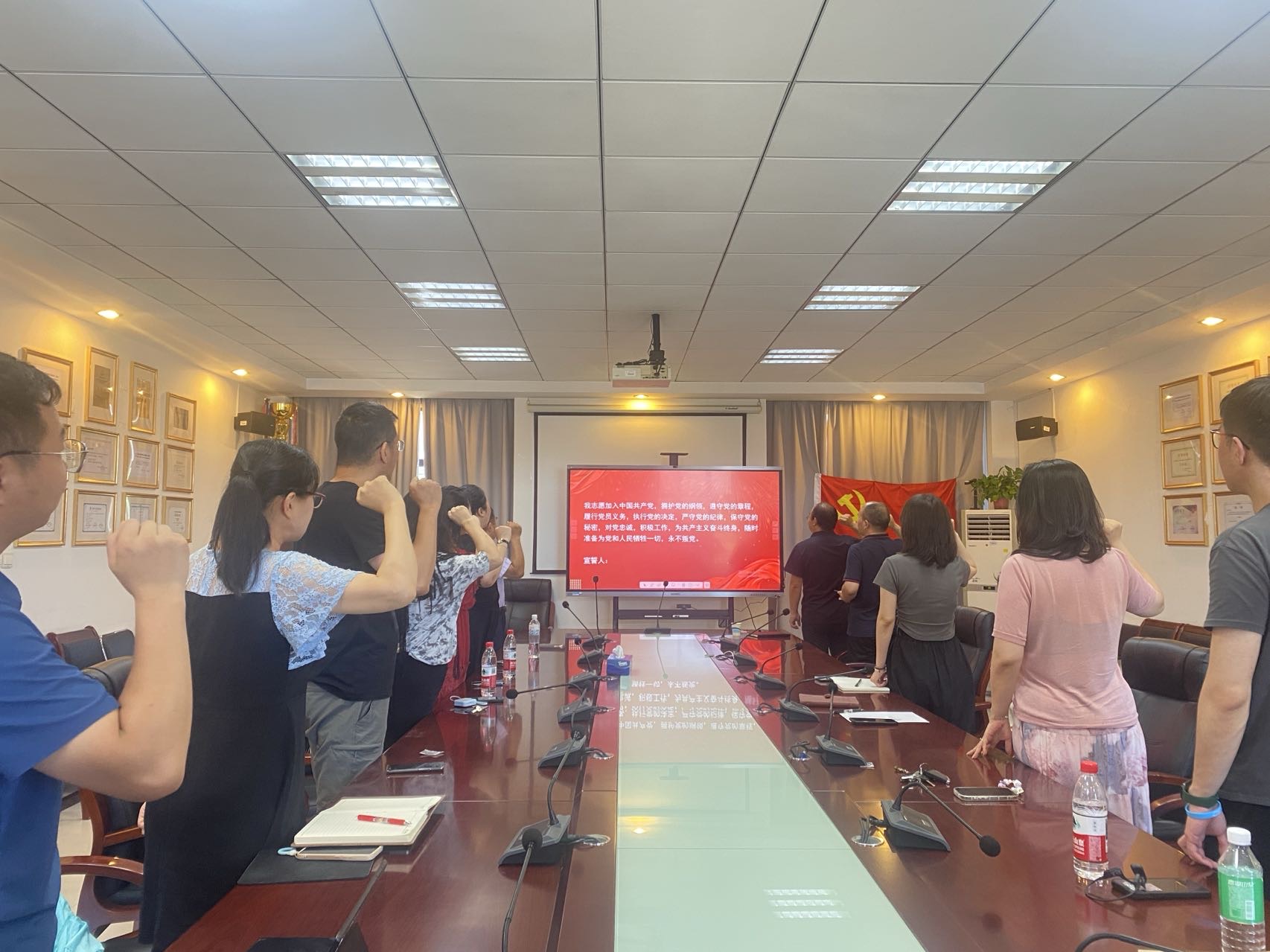“起来,不愿做奴隶的人们......”活动伊始,全体党员肃立齐唱国歌,雄壮的旋律激荡着每个人的爱国情怀。随后,同志们面向党旗重温入党誓词,字字千钧的誓言让现场气氛庄重而热烈。“我志愿加入中国共产党……”铿锵有力的誓言回荡在会场,彰显了党员们坚定不移的政治信念和为党育人的使命担当。