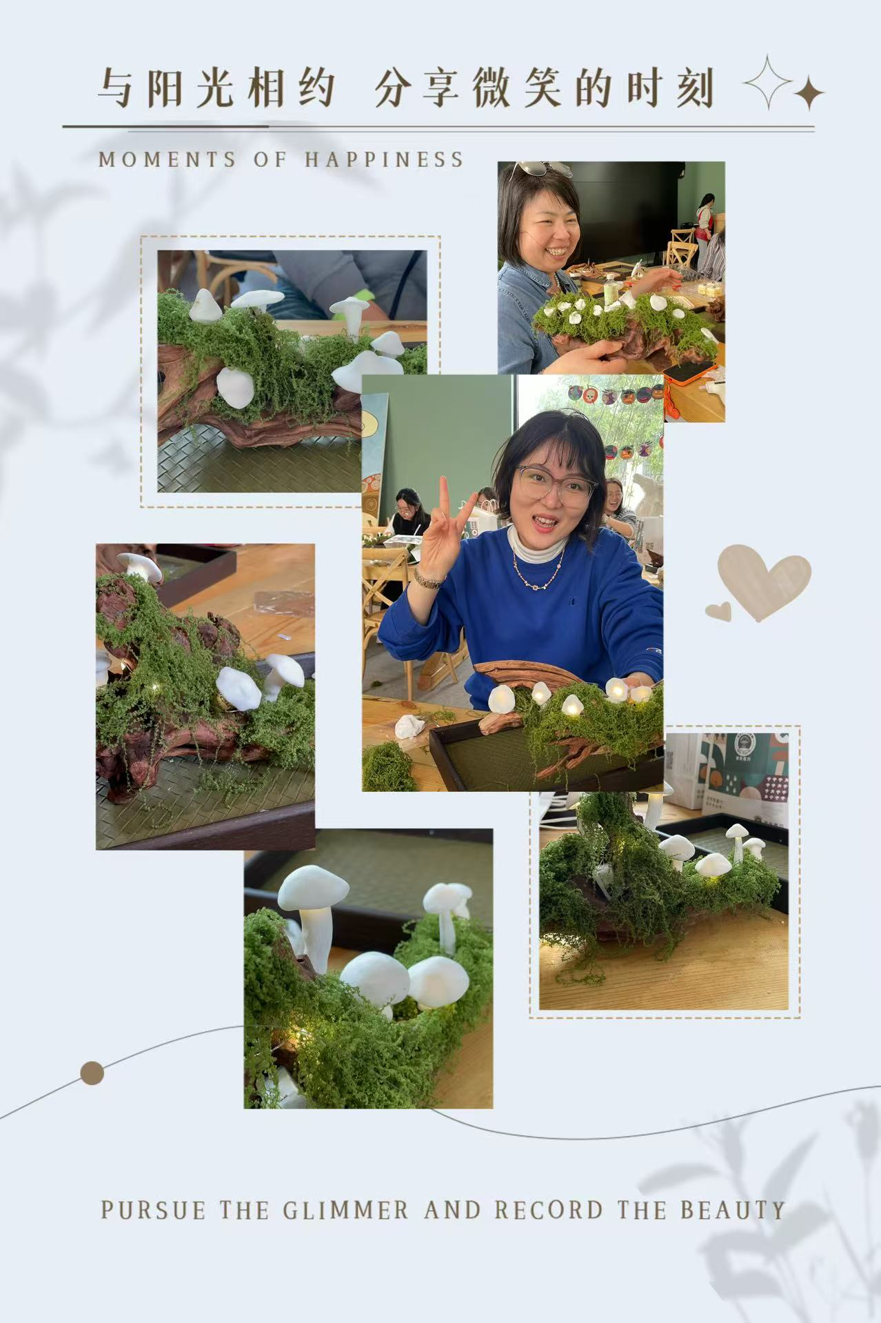 午餐过后,大家参观了园区展馆,了解生态农业和绿色种植的理念,感受现代农业与自然和谐共生的魅力。随后,老师们参与了趣味手工活动——利用树根、灯饰和橡皮泥等材料,亲手制作出一个个可爱的“小蘑菇”造型,并组合成精致的微型景观展台。创意与欢乐并存,笑声此起彼伏。
