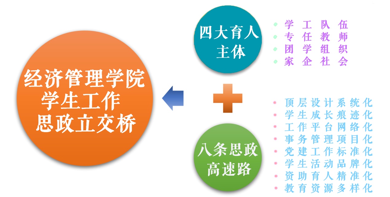 打造经管学院“思政立交桥”工作新模式——围绕“八条思政工作高速路”,建设经管学院辅导员队伍培养体系、学生党员教育培养体系、学生骨干培养体系、创新创业培养教育体系、学风建设引导体系、校园文化建设体系等六大工作体系,联通教学、管理、团学、家企社会四大育人主体,形成四位一体育人格局,打造经管学院四通八达的“立交桥式”工作新模式,推动思政工作进入快车道、驶上“立交桥”。