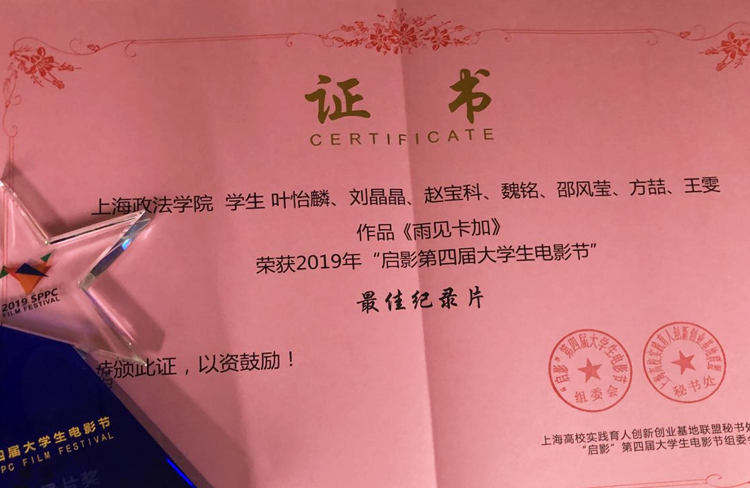 6月5日,由上海高校实践育人创新创业基地联盟主办的“启影”第四届大学生电影节在上海出版印刷高等专科学校礼堂举办。上海纪录片学院学子创作的作品《雨见卡加》获得“最佳纪录片奖”。