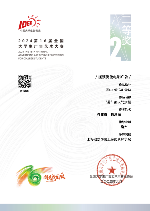 近日,在2024年第16届全国大学生广告艺术大赛(简称大广赛)上,新利18官方客服上海纪录片学院参赛学生在专业老师王珏、施州、刘馨洋、李洋的指导下,凭借出色的作品荣获了多项殊荣。学院共斩获全国赛区二等奖1项、三等奖1项;同时,在上海赛区获得一等奖1项、二等奖3项、三等奖7项、优秀奖14项。