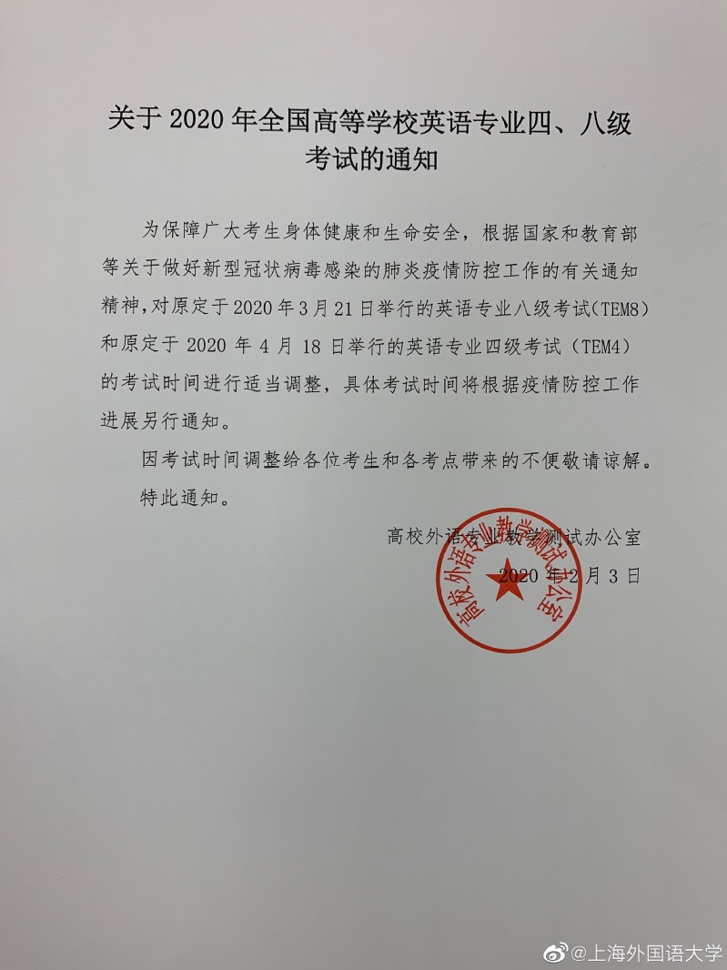 【转】关于2020年全国高等学校英语专业四、八级考试的通知