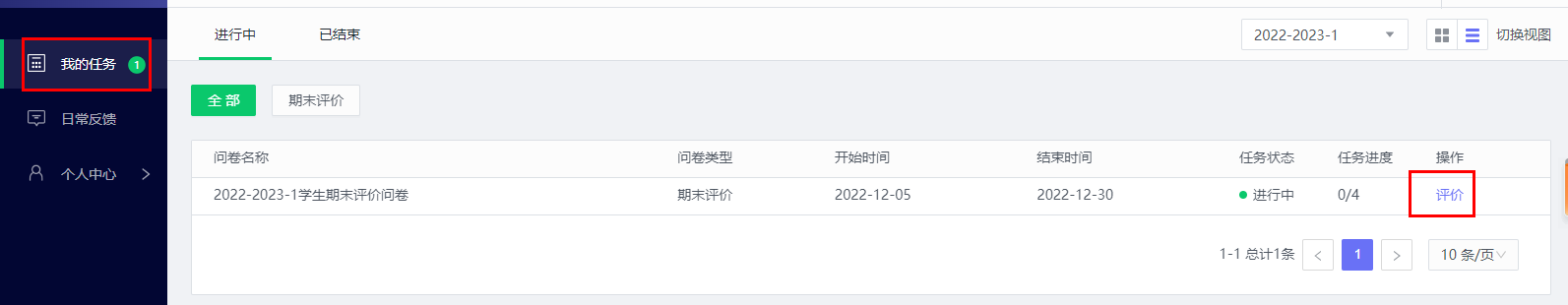 登陆平台后在“我的任务”中找到“2022-2023-1学生期末评价问卷”,点击“评价”即可对本学期的授课教师进行评价,如图: