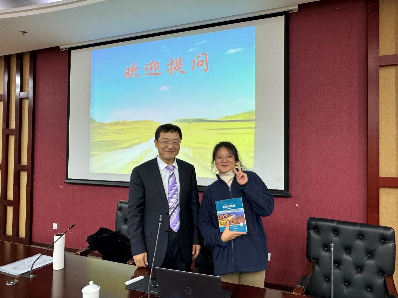 在提问环节,针对同学们提出的“如何使用比较法方法论进行论文写作“”如何能够快速对外国法律形成基本的概念“等问题,许庆坤表示,不同法系之间存在巨大差异,应当充分挖掘矛盾背后存在的共性,透过现象看本质,以问题为导向,立足中国大地做学问;养成良好的外文文献阅读习惯非常重要,如坚持数月不间断阅读同一领域外文文献。许庆坤教授还将本人译著《美国法概论》赠予提问同学,勉励法学新生刻苦求学,为法治中国建设贡献才智。