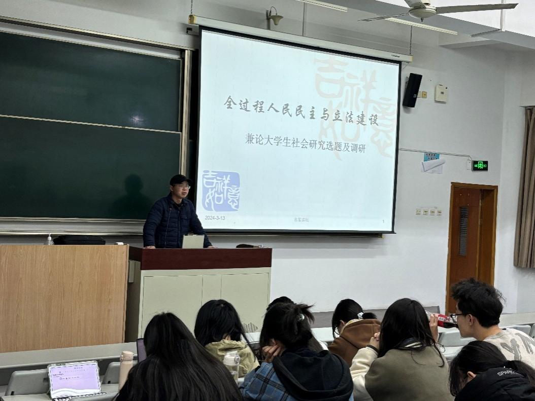 在讲解大学生社会研究选题与调研有关内容的基础上,石发勇老师引出“全过程人民民主与立法建设”的主题,并以上海普陀区曹杨新村街道为例,就如何学习贯彻法治思想、推进全过程民主建设和基层治理总结了相关经验和启示。